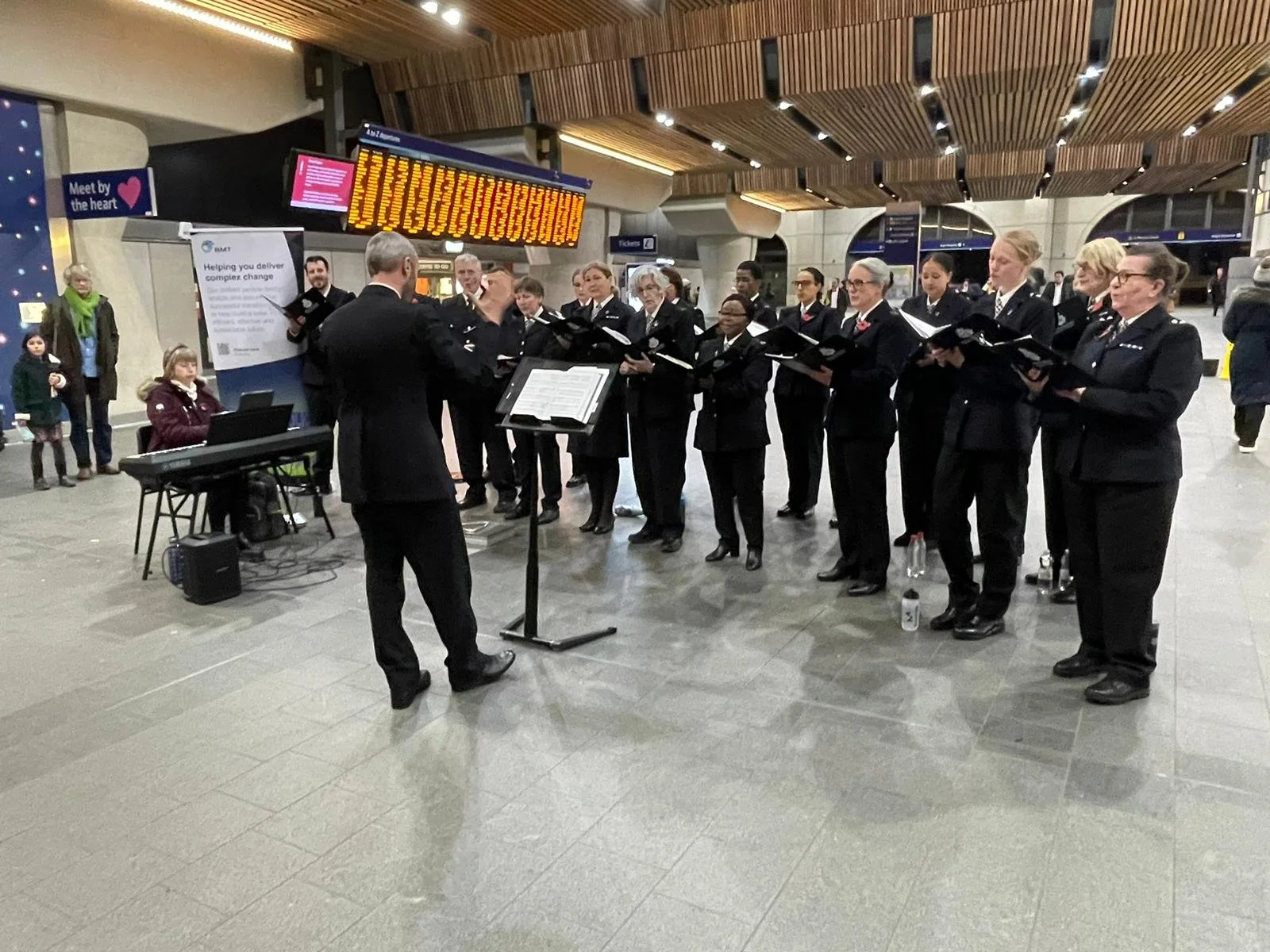 Last week the MPC was very proud to assist the Royal British Legion by singing to commuters at London Bridge station. Despite Storm Ciaran doing its best to hinder us a good number of the choristers managed to make it to this fundraising event which the choir has supported on many other occasions. A few doughty choristers heaved the piano, amps, music stands and general paraphernalia on and off the tube to London Bridge and the choir launched into their first song at 5pm. Our sponsors BMT Group Ltd also have a very close relationship with the Legion which made the performance extra special for us